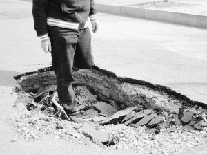 当日9时许,记者来到现场看到,这个椭圆形的坑最宽处有1米多,路表沥青层因失去下面土层的支撑,成块碎裂掉入坑中,坑里还有散落的建筑用碎石(如图)。