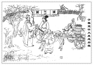 一次,子骞的父亲外出办事,要子骞驾车。冰天雪地,子骞身上芦花做的衣服哪里能抵挡住冬天的严寒?双手被冻僵了,嘴唇被冻紫了,一阵寒风吹过,子骞剧烈抖动的身体实在没法抓紧缰绳,一失手,缰绳脱落了,这样就引起了马车很大的震动。因为子骞驾车的技术一向很好,今天却大失水准。坐在后面的父亲身体猛晃,就非常生气地抽了他一鞭子,结果衣服破了,芦花飞了出来,子骞的“棉衣”里全都是一丝丝的芦苇絮,没有一片棉絮或丝絮的影子。父亲顿时脸色大变,问怎么回事?子骞怯懦着不敢回答。但父亲明白了,肯定是妻子的罪孽。做父亲的眼睛湿润起来,真没想到同床共枕的妻子竟有如此恶行,对继子这样狠毒。回去后,子骞的父亲决定把妻子赶出门去,从此休了她。一听此言,子骞扑通一声跪在地上,含泪抱着父亲说:“母在一子寒,母去三子单。”这就是说,后母在只有我一个人寒冷;如果后母不在,家里的三个孩子都要受冻挨饿。他的这番话使父亲非常感动,于是就决定收回成命,以观后效。看到子骞一点都不怀恨于心,后母也深受感动。她对自己的行为深感后悔,从此就把子骞当成自己的亲生孩子一样疼爱。一家人其乐融融,从此充满了欢笑和温馨。