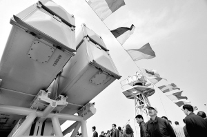 由于“芜湖号”导弹护卫舰是现役军舰,市民只能在甲板上参观,场地有限,现场维持秩序的官兵及民警只好每隔15分钟允许一拨市民登舰。当天近6万名青岛市民涌进奥帆中心感受军舰魅力。图为青岛市民正在军舰上参观。中新 摄