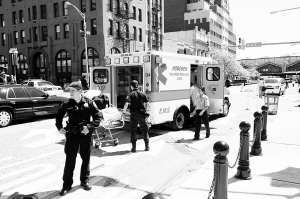 5月8日,一辆救护车抵达事故现场附近接收伤员。美国东部时间8日上午9时左右,一辆火车在新泽西州霍博肯市火车站出轨冲上站台,大约30人受伤。新华社发