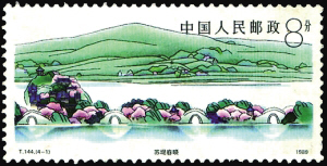 T.144《杭州西湖》邮票中的“苏堤春晓”(图3)展示了桃树、柳枝的风姿,恰到好处地表现出苏堤春色。