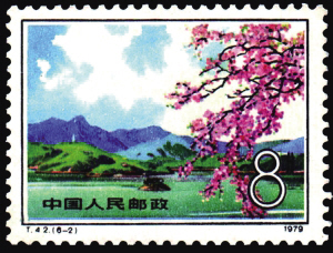 T.42《台湾风光》邮票中的“日月潭”(图5),近景展现了粉艳的桃花、静谧的潭水,远景是青翠的山峦、洁白的云朵、蔚蓝的天空。分明的层次、多样的色彩,展现了日月潭亮丽的景色。