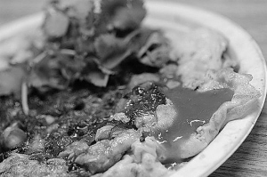 海蛎煎选用的是黑耳白肚、个头小小的海蛎珠,味道很是鲜美。拌和青蒜、韭菜、地瓜粉,摊入油锅,两面煎透。讲究一点的,还要在入锅后,再摊上打散的蛋液,一道煎熟。起锅时,撒点胡椒,放点儿香菜,吃时再蘸上芥末、辣酱,好吃得简直连舌头都会一起吞下去。