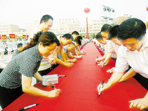 为庆祝伟大的中国共产党成立90周年,6月29日18时,太康县近万名党员干部汇聚人民广场,在一条百米横幅上郑重签上自己的名字,响应县委倡议,承诺做干事创业的先锋,做爱岗敬业的典范,做服务群众的楷模,做执行有力的表率,勇立时代潮头,牢记宗旨,践行使命,引领社会发展,用扎实的工作去迎接美好的明天。