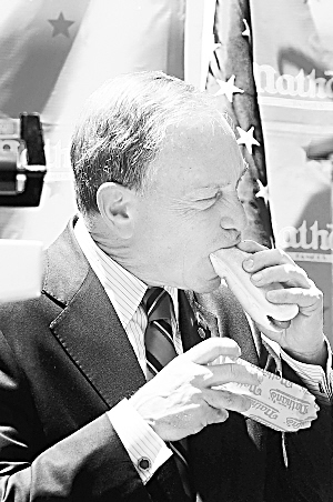 据新华社电 当地时间7月4日,世界吃热狗大赛在美国纽约康尼岛举行。1日,纽约市长布隆伯格参加了大赛的赛前称重仪式,在仪式上他津津有味地嚼起了热狗。