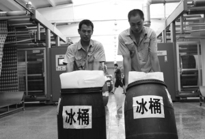 7月6日,山东即墨市即发集团染整生产车间的工人把降温用的冰块拉到自己的机台前。