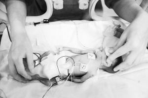 7月11日,“袖珍男婴”在湖南省儿童医院新生儿监护室接受治疗。7月9日,位于长沙的湖南省儿童医院收治了一名体重仅500克的男婴。据了解,这名男婴7月9日出生于湖南省株洲市,是孕周只有24周多1天的早产儿,体重仅500克,身长28.5厘米,全身皮肤呈半透明状,皮下的血管清晰可见,四肢只有成人一根手指大小。新华社发