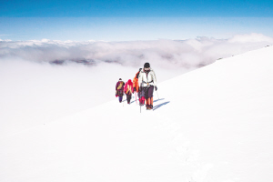 这是一个正确的判断!果然,走过5800米,似乎一下子就碧空万里了,浓雾、云海就踩在脚下,那感觉十分惬意、骄傲。因为之前一直被大雾困扰,根本看不见太阳,“半个小时涂一次高倍防晒霜”的告诫早就被几个女队员丢到九霄云外。在太阳直射下,王艳梅们很轻易地就被晒伤了。