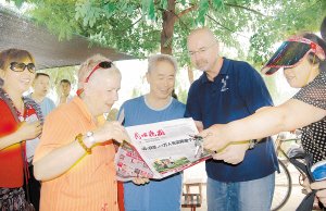 “《周口晚报》办得好,谢谢你们!” 7月12日上午,在鹿邑县陈抟公园,即将返回悉尼的世界卫生组织的专家对《周口晚报》赞叹不已。得知《周口晚报》曾报道了他们来鹿邑“悟道”的消息后,几位专家非常感兴趣,并找来一份刊有他们消息的《周口晚报》,在翻译的帮助下仔细阅读。晚报记者 侯国防 通讯员 蒋保庆 摄 线索提供 龚耕