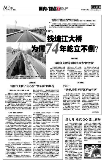 但是与它同江一望的钱塘江大桥,74年来任凭风吹浪打,岿然不动,被网民热捧为“桥坚强”。