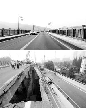 7月23日,建成已74年的钱塘江大桥依然“坚强”(上图),而建成不过14年的钱江三桥引桥却塌了,成了“桥脆脆” (下图)。