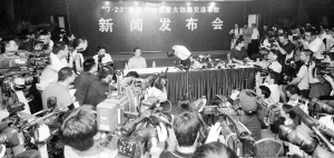 7月24日晚的发布会上,铁道部新闻发言人王勇平鞠躬致歉。新华社发