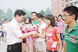 图为淮阳县教体局局长刘伯俊为学子递上录取通知书和鲜花。