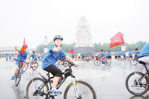 8月7日上午,鹿邑县一自行车骑行协会的150名队员通过4个小时的环城绕行活动宣传全民健身、低碳生活。他们还在老子文化广场表演了自行车花式骑行,吸引不少人报名参加骑行健身活动。晚报记者 侯国防 摄 线索提供 刘晓彬 蒋保庆
