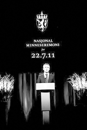 挪威首相斯托尔滕贝格在悼念仪式上致辞(下图),“我们一起克服了仇恨。让我们一起拥抱开放、宽容和团体意识”,“我们欢迎那些迷失者回家。但对那些诉诸暴力的人,我们会击败他们……他们走到哪里,都会发现我们挡着他们的道”。