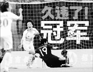 女足决赛从一开始就被“淹没”在4万名球迷的呐喊声中,身穿白色球衣的中国队好似白色浪潮,伴随着球迷的呐喊,一波接一波地冲击着日本队的阵地。然而,率先进球的却是对手。第33分钟,久攻不下的中国队犯下错误,日本队竹山裕子前场抢断后倒地传中,中出光中路停球转身顺势打门,球入死角,中国队0比1落后。