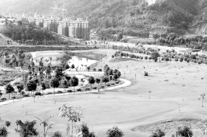 然而,政府规划却在实际执行中“变了味”。2009年10月,开发商——惠州市惠阳金玉东方实业发展有限公司开始建设高尔夫球场。在销售人员带领下,记者以购房者身份探访,发现高尔夫球场已基本建好:绿油油的草地修剪得整整齐齐,沙坑只待填沙,水龙头忙着喷水。高尔夫球场对面,大量原生态的山林被推掉,黄土裸露在外,工程车来来往往,尘土飞扬,人工湖旁边的3座独栋别墅基本建成。