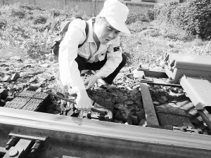 记者正在惊叹耿万里好眼力时,他走了几步又弯腰拔掉铁轨间刚长出来的杂草。“这也是我们要处理的情况,铁轨之间是不允许长出杂草的。”耿万里又给记者上了一课。