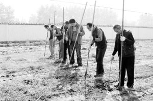 这样机械、重复的劳动一直持续了3个多小时,依然没有一点收获。记者无聊地坐在草堆中看着焦华中对土块进行分析。“你们拿洛阳铲走远一点,再打些洞来。”焦华中不放心地安排那些手拿洛阳铲的工人们。