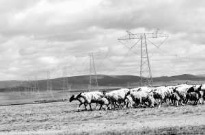 羊群经过沱沱河段的青藏交直流联网基塔(9月14日摄)。