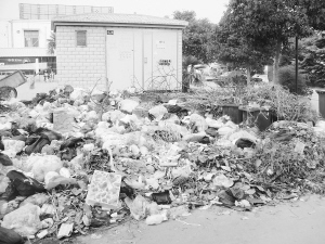 位于小区大门右侧的广场上,散布着各种垃圾,安放在广场上供居民使用的健身器材也大都锈迹斑斑。广场东北角堆放的垃圾已堆成小山,散发着阵阵恶臭。一对上了年纪的夫妇正在清理这些垃圾。“以前都是我们来清理,但我俩有1个多月没来清理了,没人给钱,今天又打电话让过来。”记者询问这对夫妇,得到了这样的答案。