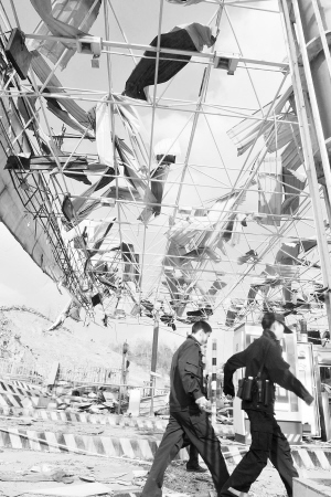 记者在事发现场看到,爆炸发生后,周边房屋的玻璃大多被震碎,路边的车辆发生变形,附近一国家粮食储备库受损严重,现场一片狼藉。爆炸波及范围大约有一个标准400米跑道的足球场大小,发生爆炸的收费站房屋基本只剩下框架结构。爆炸点形成两处直径10余米的大坑。