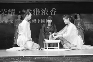 10月29日上午,由泸州老窖博大酒业营销有限公司、周口日报社主办、周口华富酒业承办的“金奖特曲荣耀中国行 道德光芒照周口”大型义卖活动在周口人民商场南门举行。此次活动持续两天,我市市民积极参与了义买活动,共筹集资金30000多元,所得款项全部捐给我市贫困道德模范。图为演员在进行酒道表演。