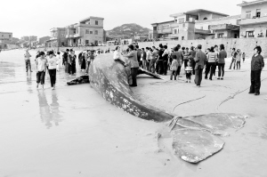 11月6日,当地群众驻足围观死亡灰鲸。5日,一具鲸鱼尸体被福建平潭白青乡渔民在海中发现后用船只拖上岸。渔民随即向当地边防派出所报警,边防官兵通知当地渔业部门进行处理。6日上午,经渔业专家初步鉴定,这头死亡鲸鱼的品种是灰鲸,长约13.9米。目前,当地边防、渔业部门正在联系有关部门对鲸鱼尸体进行处理。新华社发