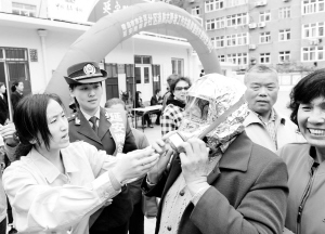 11月7日,青岛市延安一路社区居民在体验家庭消防应急包。