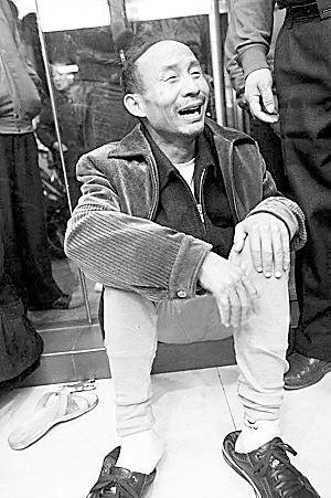 一群人搀扶着这名男子,并安抚他。一名知情者低声告诉记者,“他叫熊尿保,今年52岁,在南浦路给人卖水泥,这群搀扶着他的人中有好几个都是在大火中被他救出来的。”