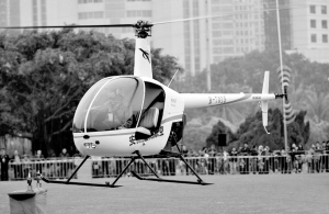 12月17日,2011中国首届环海南岛飞行拉力赛在海口举行。本次比赛有来自全国的20架动力悬挂滑翔机和25名飞行员,分别参加全长约550公里的飞行拉力赛。在开幕式现场,直升机在空中向观众展示飞行特技、航空模型器低空飞行表演竞相呼应、“仙女”飘然从天而降、跳伞队员高空跳伞表演“绽放”烟花特技。图为飞行员驾驶直升机演示开启啤酒瓶盖。