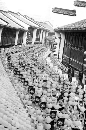 浙江省湖州市衣裳街悬挂了上万盏红灯笼(12月21日摄)。