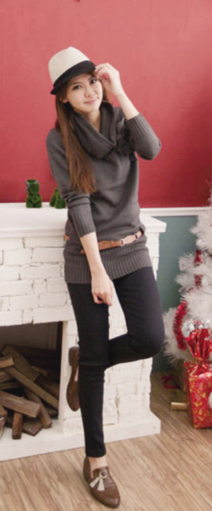 一款附围脖与编织皮带侧蝴蝶结长款毛衣,柔软舒适的毛织面料,延伸性好,附有同色围脖保暖性强。