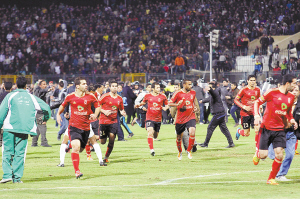 2月1日,在埃及塞得港的足球骚乱中,阿赫利队球员离开球场。