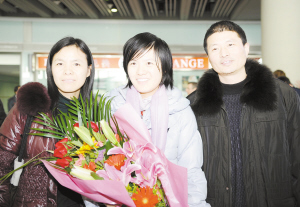 2月5日,中国棋手侯逸凡(中)在机场与前来接机的父母合影。当日,侯逸凡结束直布罗陀国际象棋公开赛抵京。北京时间2月3日凌晨落幕的第十届直布罗陀国际象棋公开赛中,侯逸凡积8分获得亚军,创造了直布罗陀公开赛创办十年来女棋手的最佳战绩。