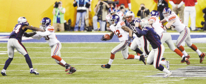 2月5日,巨人队球员耶雷尔(左三)在比赛中进攻。当日,在第46届美国职业橄榄球总决赛中,纽约巨人队以21比17战胜新英格兰爱国者队,赢得“超级碗”。