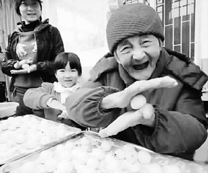 2月5日,合肥市蜀山区竹荫里社区里的志愿者们陪同空巢老人和孩子们一起制作汤圆。图为百岁高龄的老人黄竞文展示自己包的汤圆。