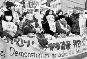 在韩国首都首尔的日本驻韩大使馆前,韩国慰安妇受害者和众多市民在示威。新华社