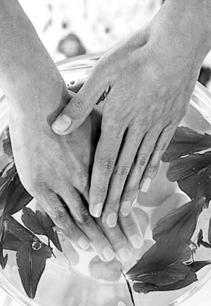 准备材料 :橄榄油、白酒、柠檬汁、清水、盐(最好是海盐)、风干花瓣。