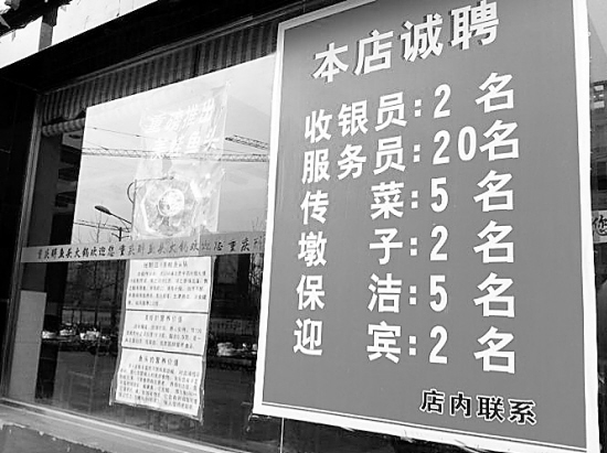 春节过后是企业招聘和个人求职的旺季。近日,记者在市区汉阳路、文明路和光荣路等饭店比较集中的地方看到,大部分饭店都在最显眼的地方张贴了招聘信息。图为一家饭店张贴的招聘信息。(实习生 段鹏/摄)