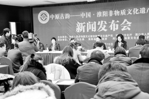 本报郑州讯 2月15日上午,由中华人民共和国文化部非物质文化遗产司、河南省文化厅、周口市人民政府共同举办的“中原古韵——中国·淮阳非物质文化遗产展演”活动新闻发布会在郑州举行。记者从新闻发布会上(如图)获悉,一年一度的淮阳朝祖会期间,将有来自山东、安徽、河北、河南、山西、湖南、湖北、江西中东部8个省份不同类型的省级以上“非遗”项目会师淮阳,参加“中原古韵——中国·淮阳非物质文化遗产展演”活动。