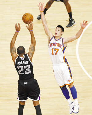 2月15日,尼克斯队球员林书豪(右)在防守国王队球员索顿。当日,在NBA常规赛中,纽约尼克斯队主场以100比85战胜萨克拉门托国王队,实现七连胜。 新华社/路透