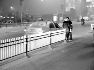 15时05分 抱着婴儿等着打车的两名女士已经在寒风中等候了十多分钟,仍然看不到出租车的身影。“有出租车来了。”“来了来了,空车灯亮着,肯定会停的。”两名女士这样互相安慰着。而这辆车牌号为豫PT096×的出租车让她们失望了,因为这辆亮着空车灯的出租车里已经坐了一名乘客。