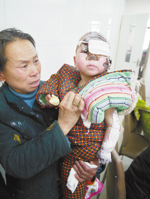 在该院四楼3号病房,记者见到了小禾。她的左半个头部涂满了药膏,正安静地依偎在奶奶怀中,睁大右眼,好奇地看着周围的一切,仿佛承受伤痛的并不是她本人(如图)。她自然也不知道,奶奶为了给她治病,已经花光了家中仅有的9000多元钱,现在已欠下医院几百元的医疗费,父亲也在2月15日离开家外出挣钱去了。
