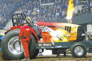 2月25日,参赛选手在比赛中。当日,第34届欧洲超级拖拉机大赛在荷兰鹿特丹举行。来自荷兰、比利时、法国、奥地利、德国的选手驾驶着经过改装的超级拖拉机,拖拽着统一重量的拖车,在一条长约100米的赛道上竞速。