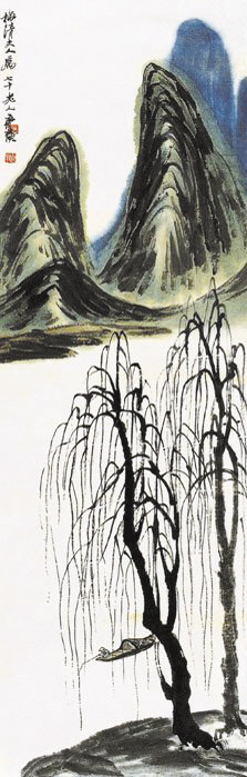 此画从构图上来看,可谓绝妙之作。画家画景仅简练地画一坡,坡上有二棵柳树,一棵用浓墨,一棵用淡墨。柳条用笔灵活自由,线条垂下而活泼。坡后一笔不着,却能表现出一片汪洋。画面布局很别致,在树梢的顶端,用没骨法画出山峰。画家在此画中的构图不受任何拘束,手法大胆而自由。同时,画面的高度简练,既体现真,又能体现画面美,是雅俗共赏的范例。