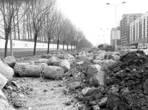昨日下午2时30分许,记者来到银珠大道上,自北向南走了一圈后。所到之处,路面伤痕累累,大坑连着小坑,很多柏油路面早已破相,裸露出黄色的泥土,而绝大部分的路面被一层碎石和渣土所覆盖。在周口一高门前,路东的人行道上被种上了各类蔬菜;而快车道上,数十个被遗弃的水泥墩柱把道路堵得严严实实,还有几大堆施工产生的渣土,足足绵延四五十米。
