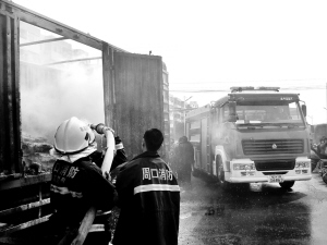 当日13时20分,记者在现场看到,起火的是一辆中型蓝色货车,车上装的是油漆、膏药和小型机械构件等物,消防人员正用水枪朝货车车厢里扫射。经过近10分钟的紧张救援,大火终被扑灭(如图)。考虑到现场情况,火被浇灭5分钟、确认无遗患后,消防人员才离开现场。