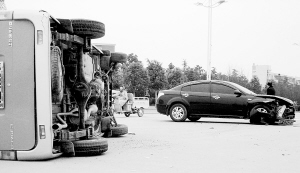 3月20日7时许,在项城市区人民路与政和路交叉口,一辆黑色轿车与一辆红色面包车相撞,致使面包车“打滚”后侧翻在地。事故并没有造成人员伤亡。目前,警方正在进一步调查此事。