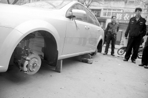 记者注意到,车轮被盗的两辆轿车都是别克车。